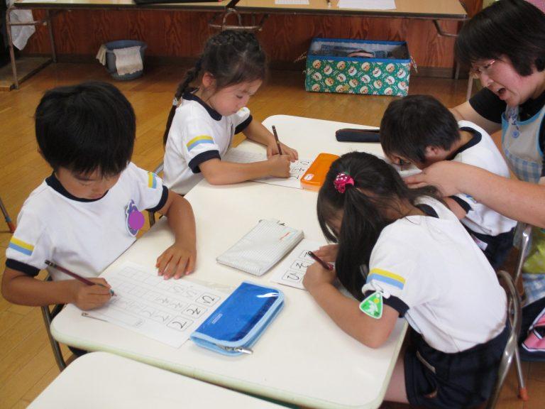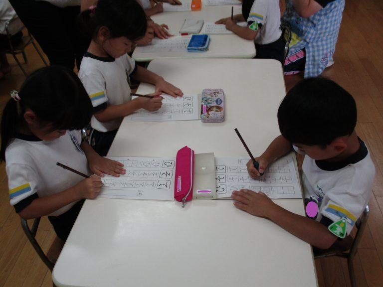 お手本を見ながらそ~っとそ~っと書いている子供たち