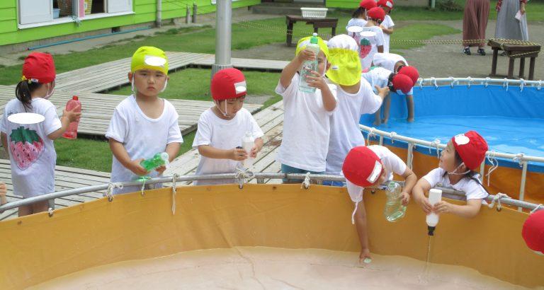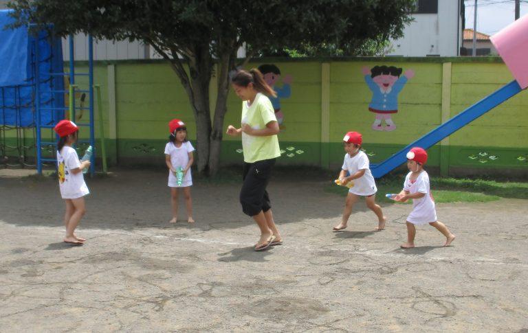 ゆり組さんは、先生にお水をかけようと追いかけたり