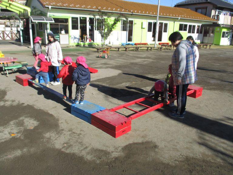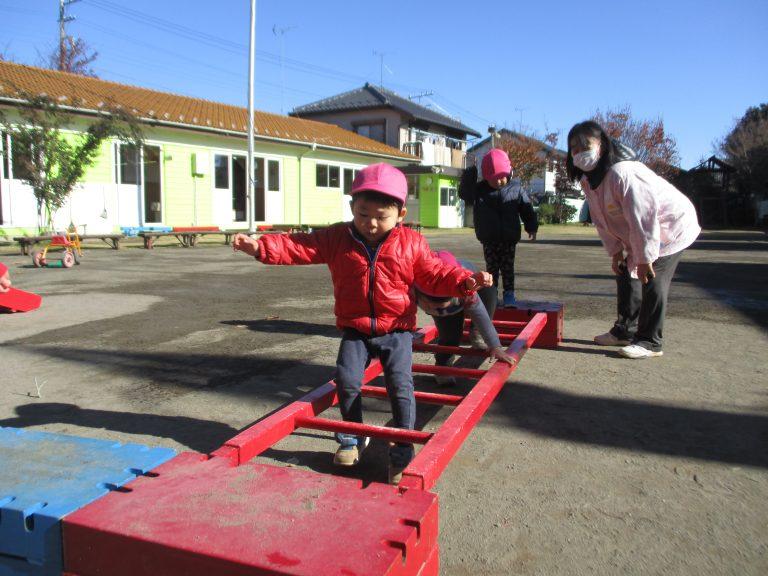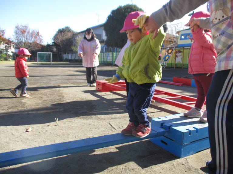 11月21日は寒い日でしたが、天気が良かったのでいちごぐみさんは園庭で巧技台を使って遊びました。