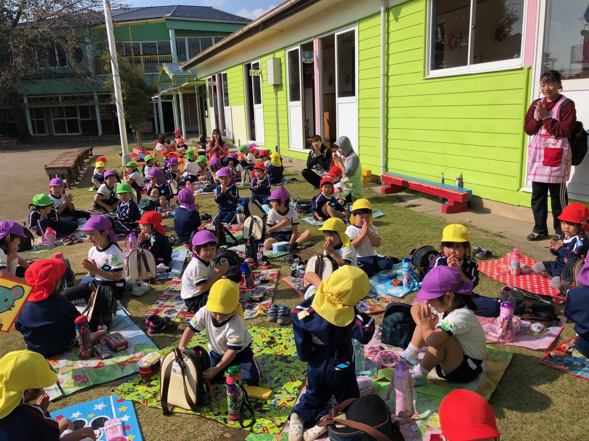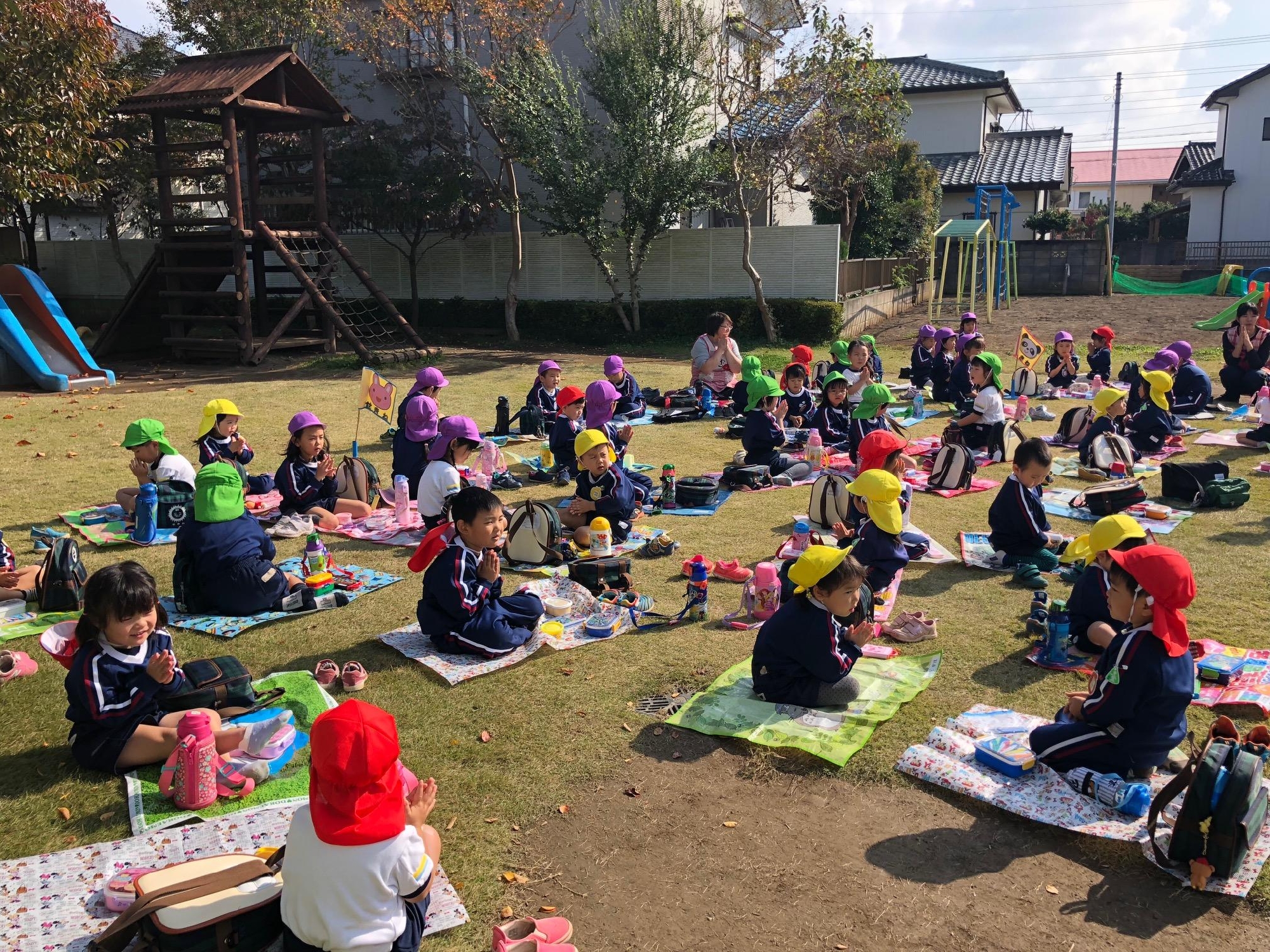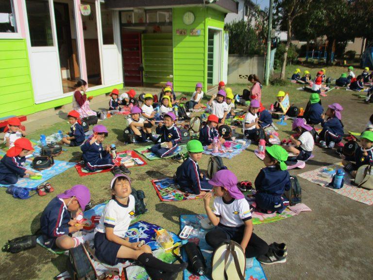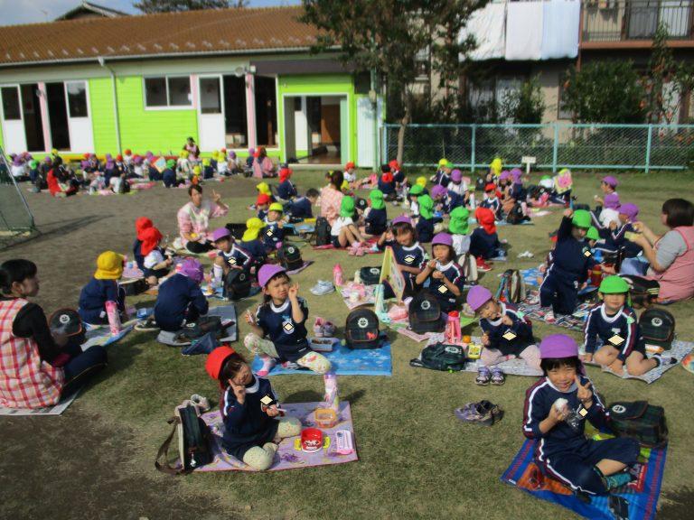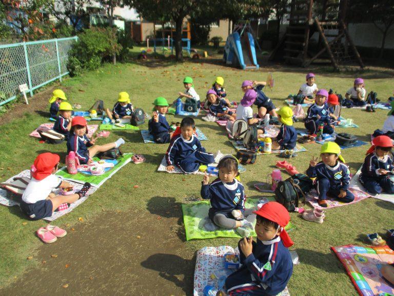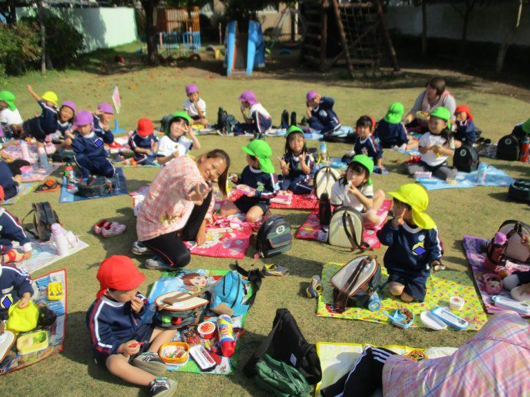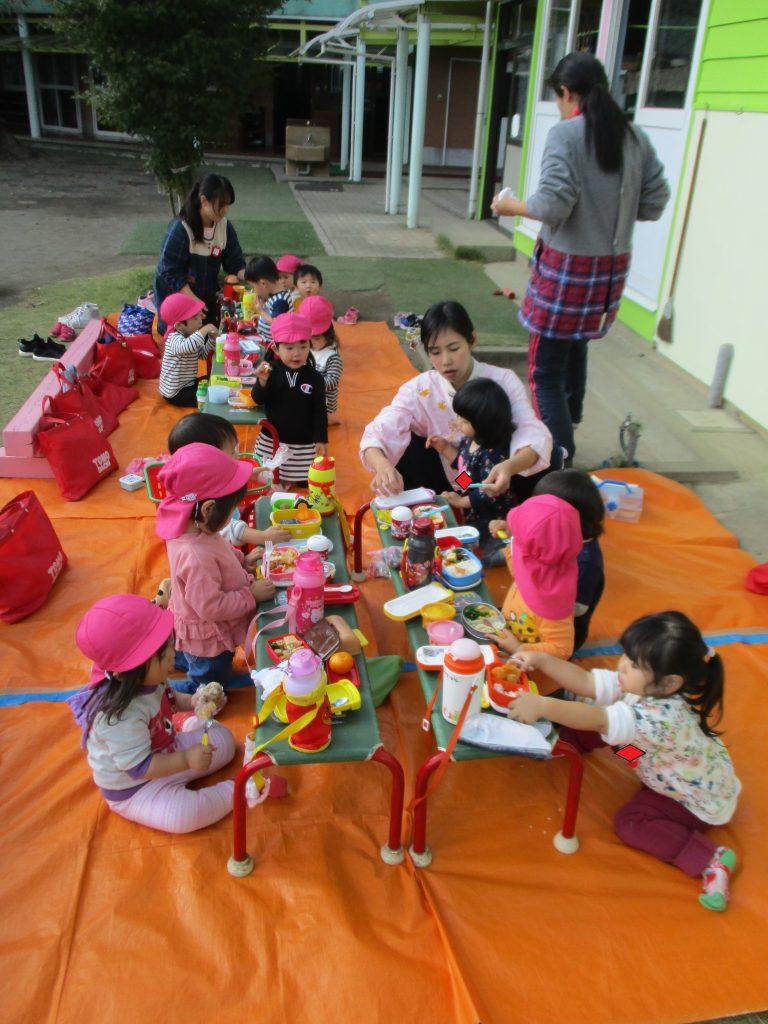 いつもとは違って、園庭で食べるお母さんたちの手作り弁当にみんなニッコニコ♪